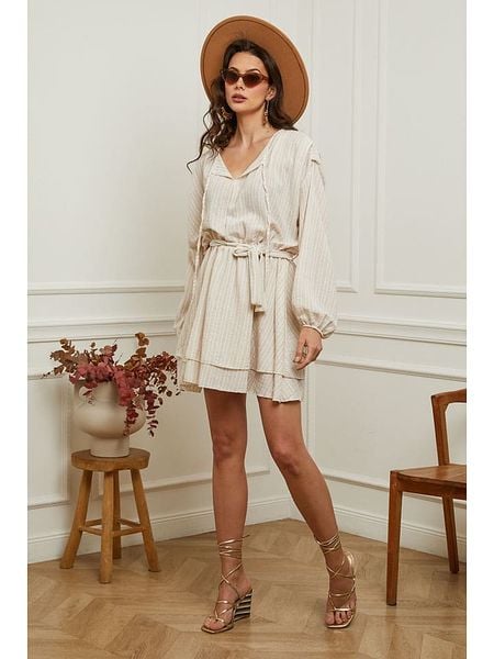 – z dodatkiem lnu- dekolt: V- rękaw: bufiasty- zakończenie rękawów: elastyczne- szlufki na pasek: tak- zdejmowany pasek: tkanina- krój: litera A- wzór: paski- look: warstwy