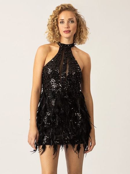– ramiączka: na szyję- zapięcie: suwak na plecach- detale: frędzelki, cekiny- krój: wąski- look: jednokolorowy