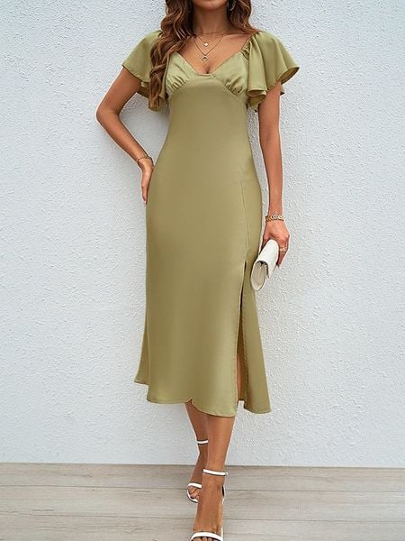 – dekolt: V- zapięcie: guzik na plecach- krój rękawów: motylek- dolny brzeg: z rozcięciem- krój: taliowany- look: jednokolorowy