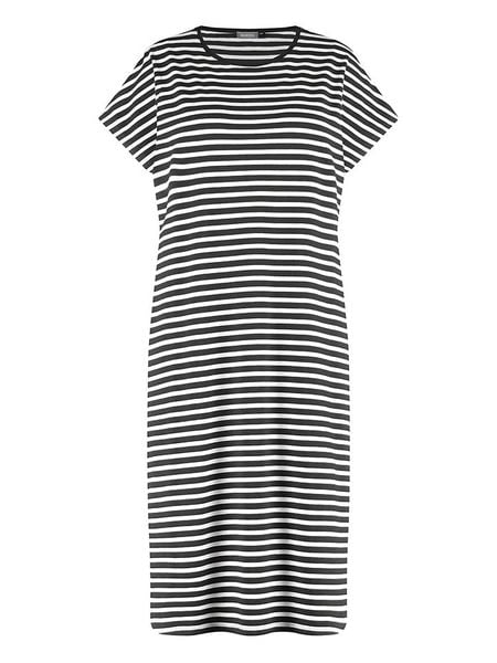 – z dodatkiem bawełny- dekolt: okrągły- krój: prosty- wzór: paski