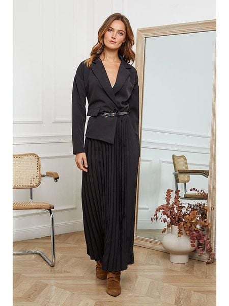 Czarna Pudełkowa Sukienka Midi z Plisowanej Tkaniny z Paskiem z Klamerką Lanaia