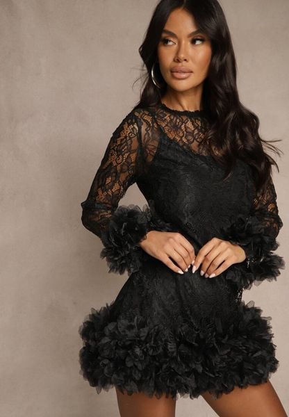 Czarna Dopasowana Koronkowa Sukienka Koktajlowa z Tiulowymi Aplikacjami Kretalia