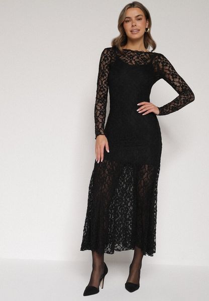Czarna Koronkowa Sukienka Taliowana z Odkrytymi Plecami Talifera