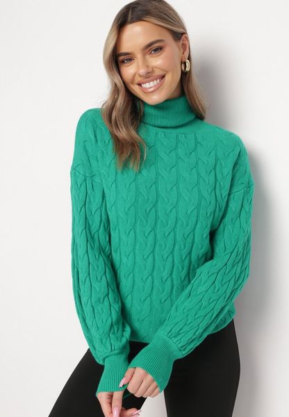 Zielony Sweter z Golfem w Warkoczowy Splot ze Ściągaczami Maraiwai