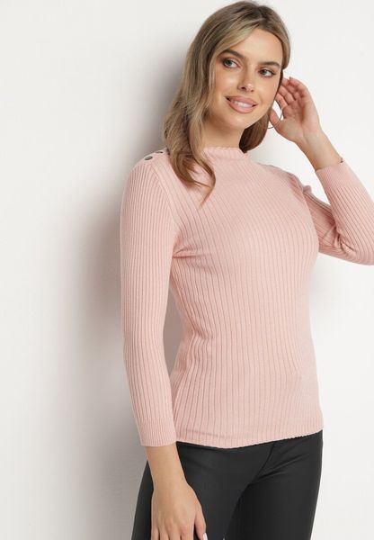 Jasnoróżowy Prążkowany Sweter z Wełną Półgolfem i Guzikami Tinnearia