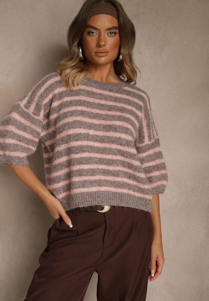 Brązowy Sweter z Wełną Ozdobiony Paskami i Bufiastymi Rękawami Rilesse