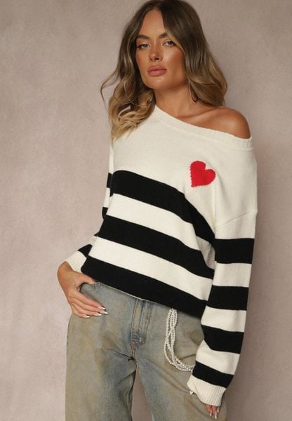 Jasnobeżowy Prosty Sweter z Domieszką Wełny Ozdobiony Wiśniową Aplikacją Balrinna