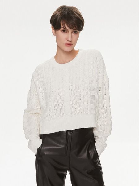 Sweter damski ze splotem warkoczowym z dekoltem v-neck kremowy Nisa 100