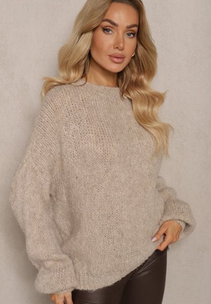 Beżowy Klasyczny Sweter z Wełną i Wiskozą o Luźnym Kroju Omethea