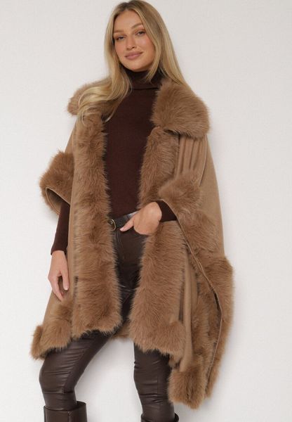 Jasnobrązowe Ponczo z Wełną i Wiskozą Ozdobione Futerkiem Delatta