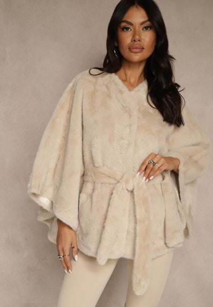 Beżowe Futerkowe Ponczo Ozdobione Paskiem Monareva