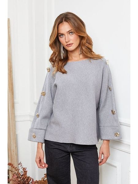 – dekolt: łódka- detale: ozdobne guziki- krój: luźny- look: jednokolorowy