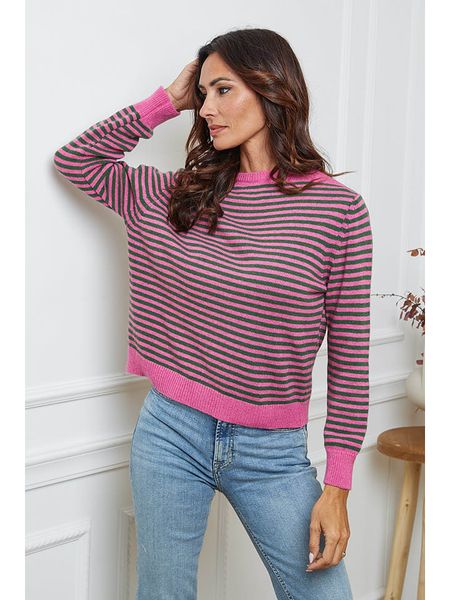 – z dodatkiem kaszmiru i wełny- dekolt: okrągły- ściągacz: dekolt, zakończenia rękawów, dolny brzeg- krój: prosty- wzór: paski- wzór splotu: ścisły