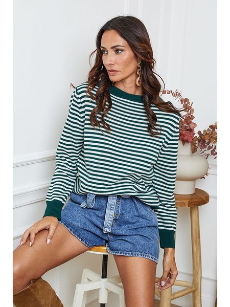 – z dodatkiem kaszmiru i wełny- dekolt: okrągły- ściągacz: dekolt, zakończenia rękawów, dolny brzeg- krój: prosty- wzór: paski- wzór splotu: ścisły