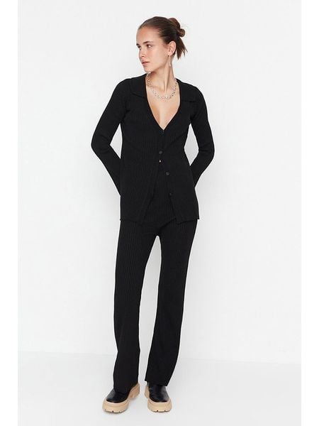 W zestawie:- kardigan- spodnieKardigan:- kołnierzyk: z klapami – zapięcie: listwa guzikowa- krój: luźny- look: prążkowany Spodnie: – pas / ściągacz: elastyczny- krój: luźny- look: prążkowany