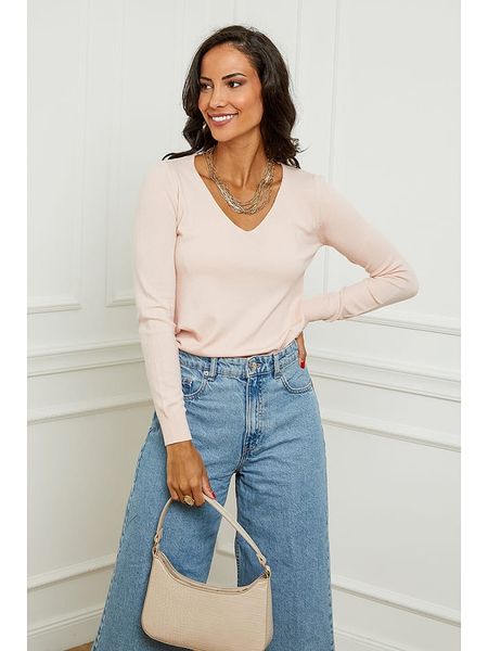 Jasnoróżowy Sweter z Dodatkiem Kaszmiru i Trójkątnym Dekoltem Silefera