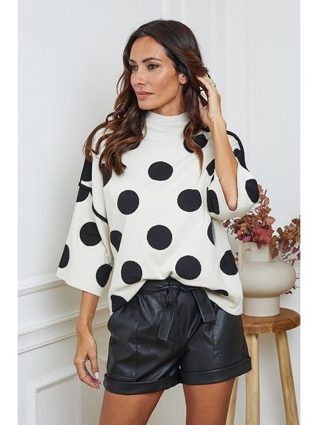 – kołnierz: stójka- krój rękawów: rozszerzany do dołu- długość rękawa: 3/4- krój: prosty- wzór: kropki- wzór splotu: ścisły