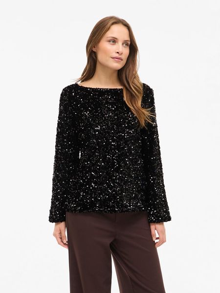 – z dodatkiem poliestru pochodzącego z recyklingu- dekolt: łódka- krój rękawów: rozszerzany do dołu- detale: cekiny- krój: prosty- look: jednokolorowy