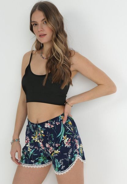 Granatowe Szorty z Wiskozy w Kwiaty i Ozdobną Koronką Marlenne