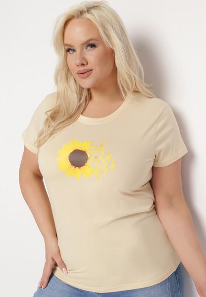 Beżowy Bawełniany T-shirt z Nadrukiem na Przodzie Galamella