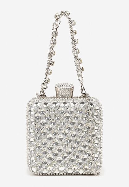 Srebrna Kwadratowa Torebka Kopertówka z Łańcuszkiem Zdobiona Cyrkoniami Realina