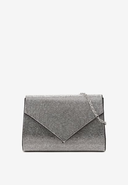 Czarno-Srebrna Torebka Kopertówka z Ozdobnymi Cyrkoniami i Metalowym Łańcuszkiem Tiamate