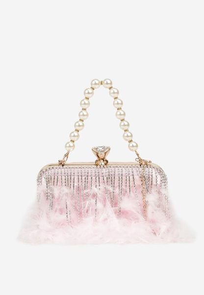 Różowa Torebka Kopertówka Vices z Perłową Rączką Piórami i Łańcuszkiem Feselissa