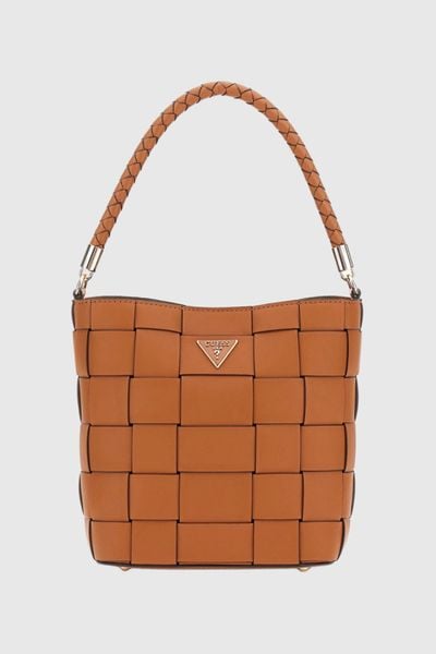 Brązowa torebka damska Maylee Bucket marki Guess, wykonana ze skóry ekologicznej. Posiada jedną komorę zamykaną na magnes, nóżki ochronne oraz regulowany pasek. Wewnątrz znajduje się kieszeń zamykana na zamek i miejsce na trzy karty. W zestawie worek przeciwkurzowy.