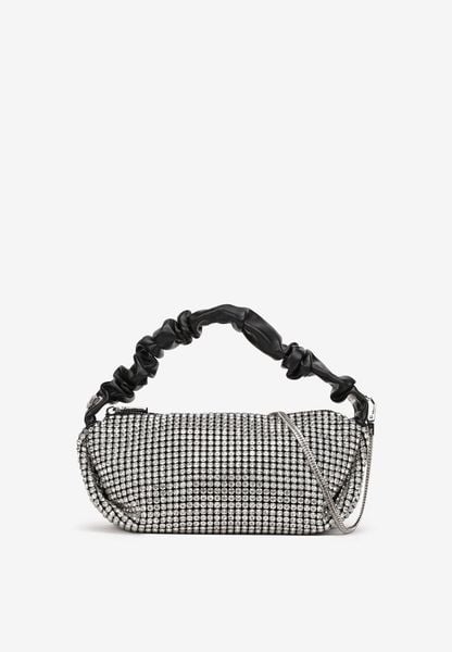 Czarno-Srebrna Mała Torebka z Plecioną Rączką i Łańcuszkiem na Ramię z Cyrkoniami na Zatrzask Teratia
