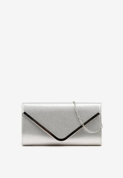 Srebrna Torebka Kopertówka z Metaliczną Aplikacją i Łańcuszkiem Flemeira