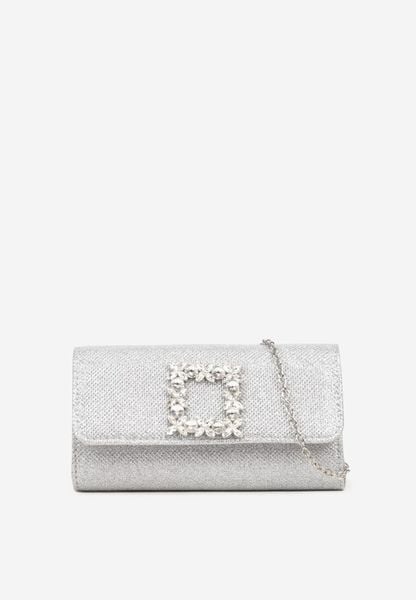 Srebrna Wieczorowa Torebka Kopertówka Zdobiona Aplikacją i Łańcuszkiem Miliorra