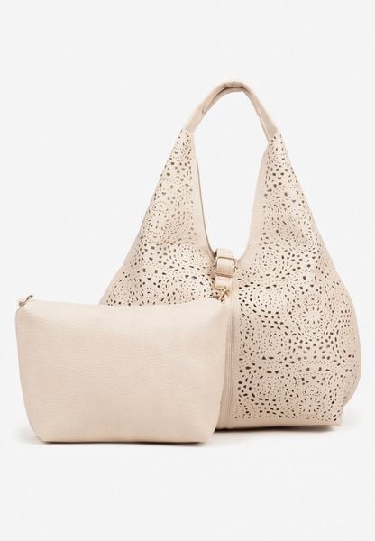 Beżowa Torebka Shopper z Ażurowym Wzorem i Dodatkową Saszetką Merabella