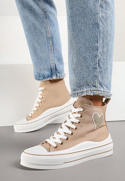 Ciemnobeżowe Trampki z Wysoką Cholewką na Grubej Podeszwie z Brokatowym Sercem Rialwa