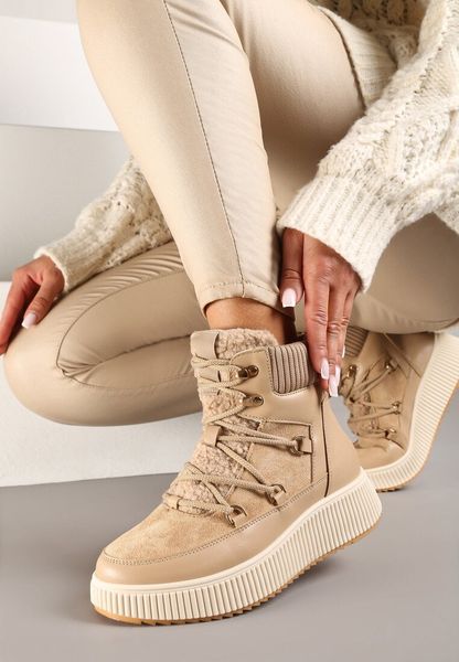 Beżowe Śniegowce na Płaskiej Podeszwie ze Sznurowaniem i Futerkiem Typu Baranek Salabira