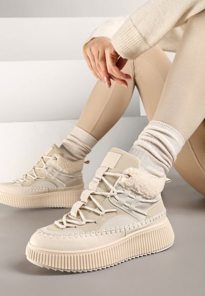 Beżowe Śniegowce Traperki Vices z Futerkiem Typu Baranek i Platformą Terivelle
