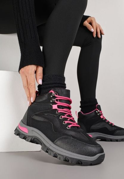 Czarno-Fuksjowe Sznurowane Buty Trekkingowe Traperki Vices na Grubej Podeszwie Afertie