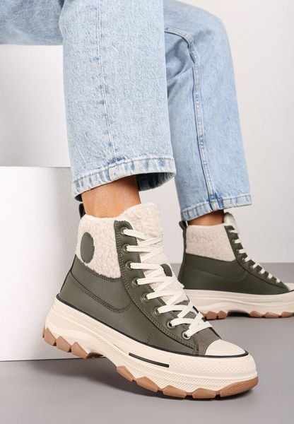Zielone Traperki w Stylu Trampek na Grubej Podeszwie Ozdobione Futerkiem Miatheae