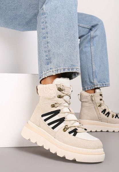 Beżowe Futerkowe Traperki na Niskiej Platformie Linivora
