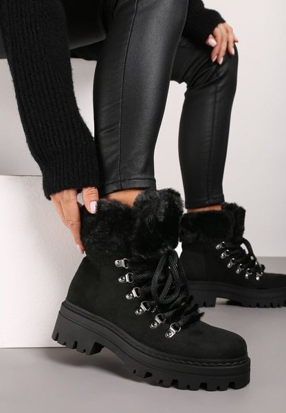 Czarne Traperki z Futerkiem na Grubej Podeszwie Tairene