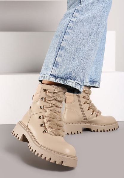 Ciemnobeżowe Trapery w Casualowym Stylu z Futerkowym Zdobieniem na Języku Taniapea