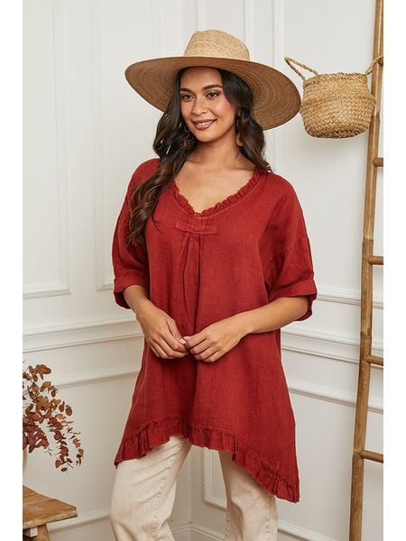 – czysty len- dekolt: okrągły- długość rękawa: 3/4- detale: falbany- krój: luźny- look: jednokolorowy