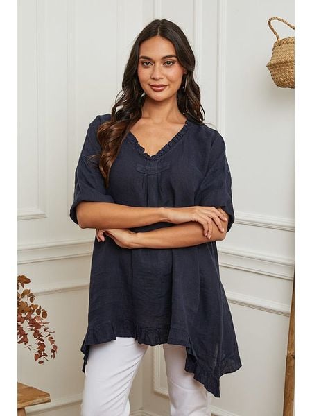 – czysty len- dekolt: okrągły- długość rękawa: 3/4- detale: falbany- krój: luźny- look: jednokolorowy